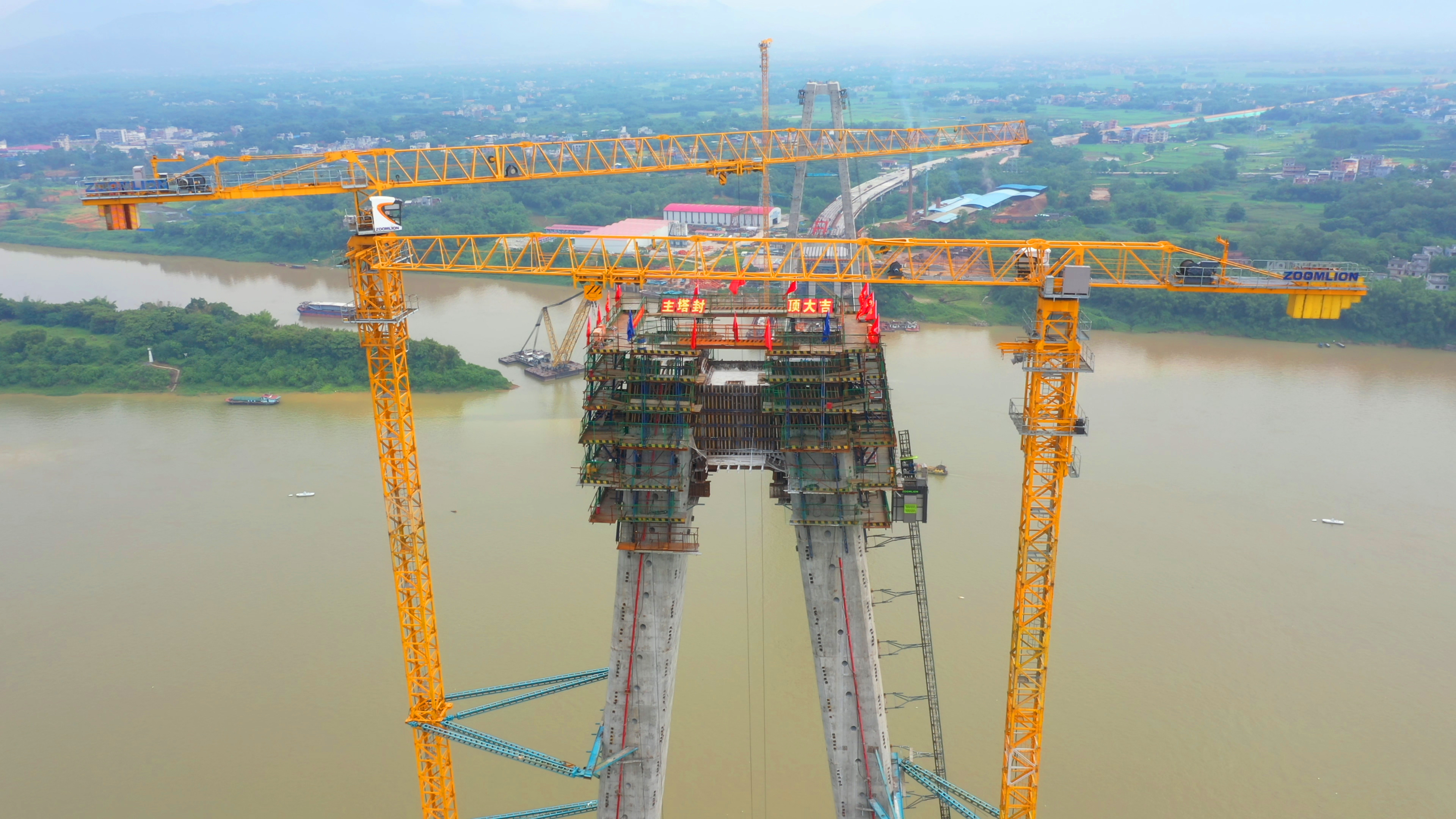 5月28日,廣西最大跨徑斜拉橋——荔浦至玉林高速公路平南相思洲特大橋?qū)崿F(xiàn)雙主塔封頂。該橋兩座鉆石型塔柱高達147.3米,為廣西最高橋塔。塔柱聳立于潯江兩岸,呈比翼齊飛之勢,大氣磅礴。